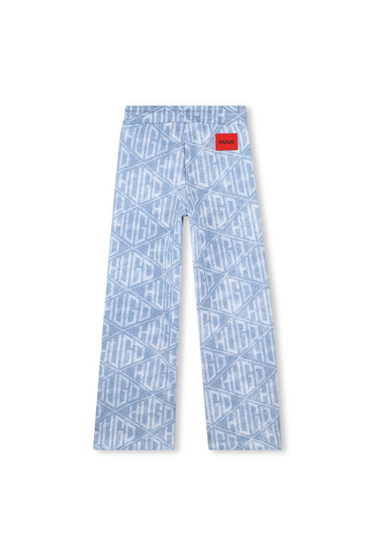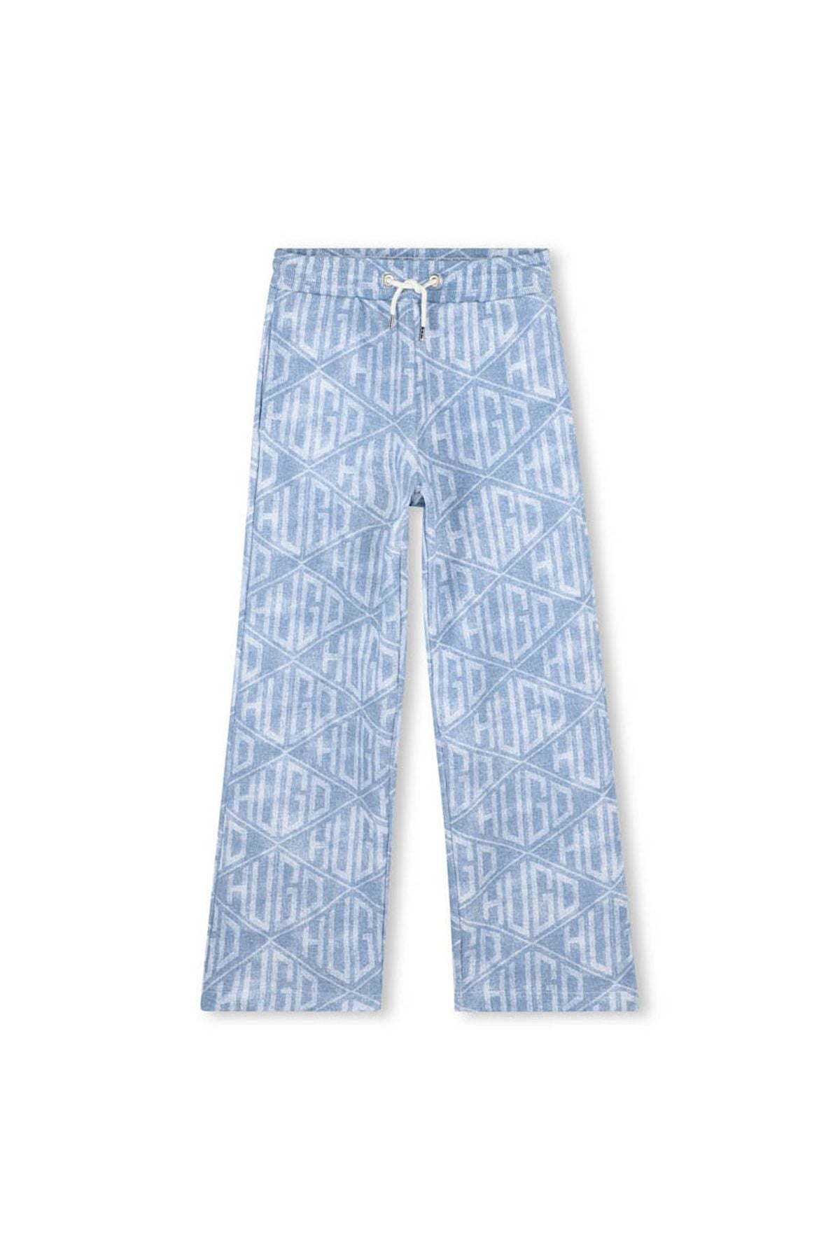 מכנסי HUGO גזרה רחבה עם הדפס לוגו ייחודי לילדות המעוצבים עם הדפס לוגו חוזר בגווני כחול בהירים למראה טרנדי ומודרני. בד איכותי, רך ונוח ללבישה יומיומית, עם גומי במותן ושרוך לקשירה להתאמה מושלמת.